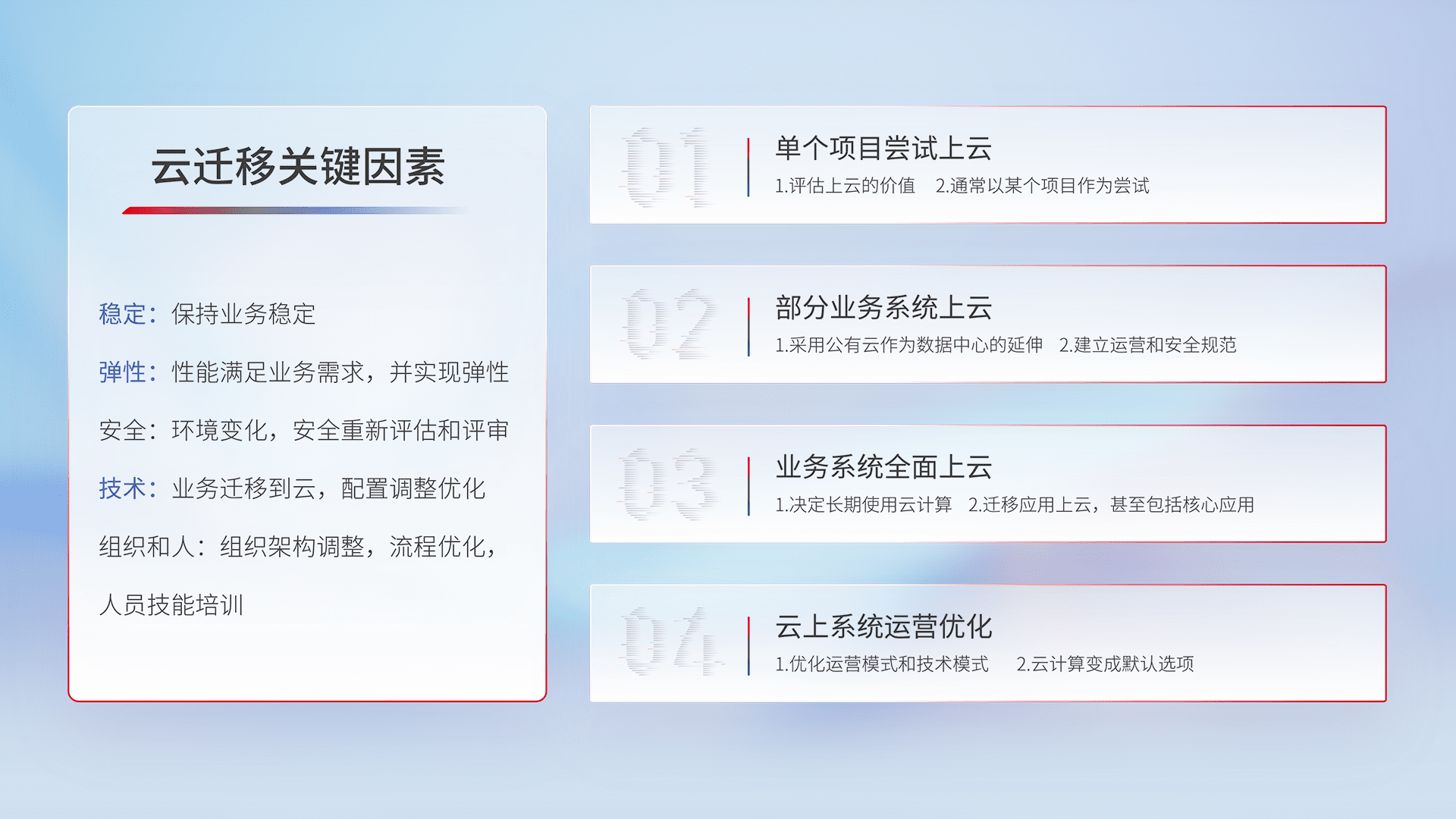 结合实际业务,,,从规划设计、、、、云平台选型、、、云原生改造、、数据迁移、、集成交付,,,,迁移全过程为客户识别最佳上云路径,,,做好风险识别管理,,,,设计网络架构、、身份权限、、安全审计合规、、、、操作审计、、日志审计、、监控告警策略、、多站点容灾设计等,,,,对云上基础设施进行整体规划,,提升IT治理水平,,,以满足弹性、、高可用、、、高性能的需求。。。。